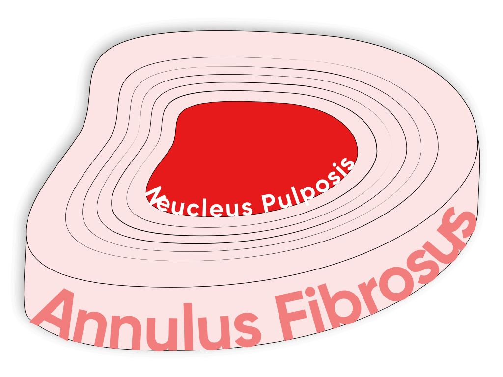 The Cervical Spine consists of seven vertebral bodies starting from the base of the skull, named C1 through to C7. For today’s topic we’re going to be focusing on the intervertebral disc (IVD) which sits in between each vertebrae (bony body) and acts as an impact cushion during activities which place load into the spine. The disc has a tough exterior called the Annulus Fibrosus (AF), and a gel-like centre called the Nucleus Pulposus (NP).